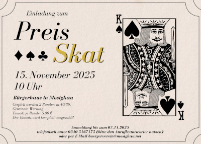 Gut Blatt- Einladung zum Preisskatturnier Der Bürgerverein Mosigkau lädt alle Skatfreunde herzlich zum Preisskatturnier ins Bürgerhaus